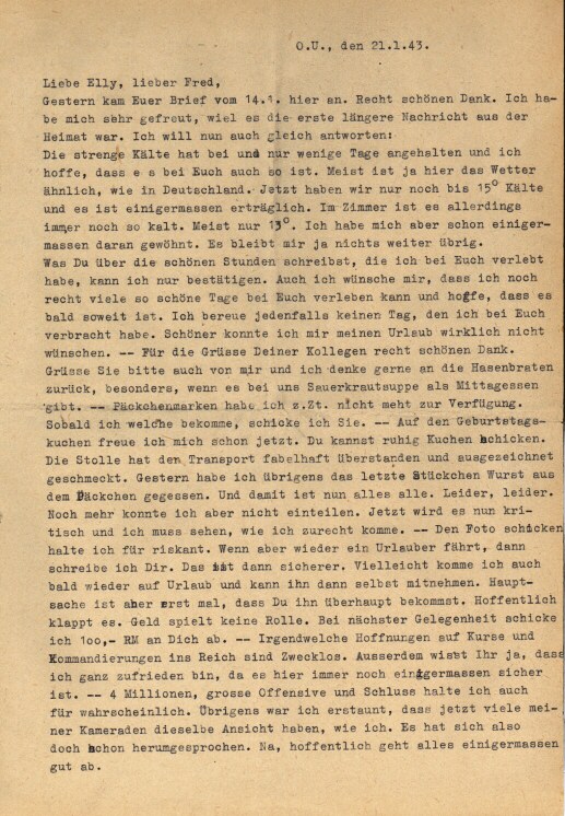 So, das wäre nun alles zu dem Brief. - Inzwischen ist auch Post von Papa gekommen. Das übliche blöde Zeug, Streit mit Onkel Alex, der nicht nur dumm sondern auch undankbar ist (!!), Streit mit der ganzen Welt, Kriegsbegeisterung usw., usw. Ich habe bald keine Lust mehr auf den Blödsinn zu antworten. Es ist immer dasselbe und 1 Brief gleicht dem anderen. - Von Egon habe ich auch einen Brief bekommen. Abgegangen am 23.12. Er steckt im Kessel bei Stalingrad. Nachschub nur durch die Luft. 7 Mann 1 Brot, nur kalte Kost, viel Arbeit und dauernd Kämpfe. Es soll furchtbar sein. Sind damals schon 4 1/2 Wochen eingeschlossen gewesen. - Sonst nicht viel neues. Ich mache viel Wache. Sonst dafür aber auch fast garnichts. Heute viel Schnee und ziemlich warm. Höchstens 5°. Diesmal scheint es der Winter mit uns gnädig zu machen. - Karamba schicke ich auch bald ab. - Den Bericht über die Stadt habe ich schnell noch fertig gemacht, weil ich ihn Euch versprochen habe. Ging aber sehr in Eile und ist deshalb nicht besonders geworden. Schreibe gelegentlich noch mehr dazu, - So, das wäre nun einstweilen alles, was ich zu berichten hätte. Hoffe nun bald von Euch mehr zu hören, besonders, wie der Fliegeralarm abgelaufen ist. Hoffentlich fängt es nicht wieder so an, wie vor 2 Jahren.